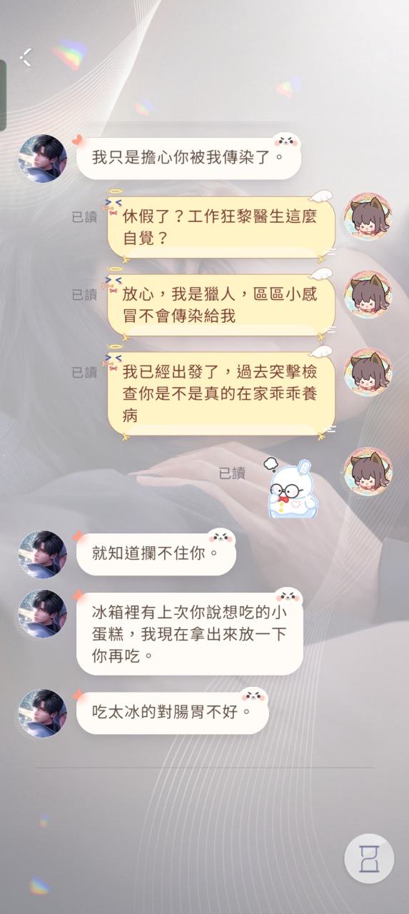 紙疊,我後悔啦!我後悔沒早點給你花錢!前期都只養魚寶跟星寶,秦徹出了之後還養了他們三個,完全沒抽黎醫生啊啊啊!但是突然想推他的原因就是,如圖: ↓預防傳染(日常) ↓顏文字(日常) 這這這也太貼心太可愛了吧!我終於知道其他獵人小姐所說的人夫感了!也太犯規了吧! 曬一下真的很愛各種墨鏡的黎深(今天他換綠色的~) 跟悲傷的卡片收集(;д;)