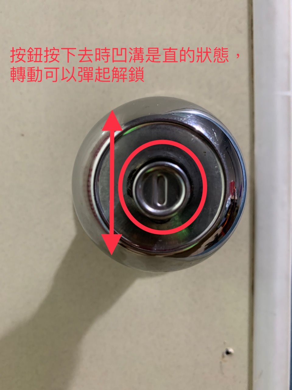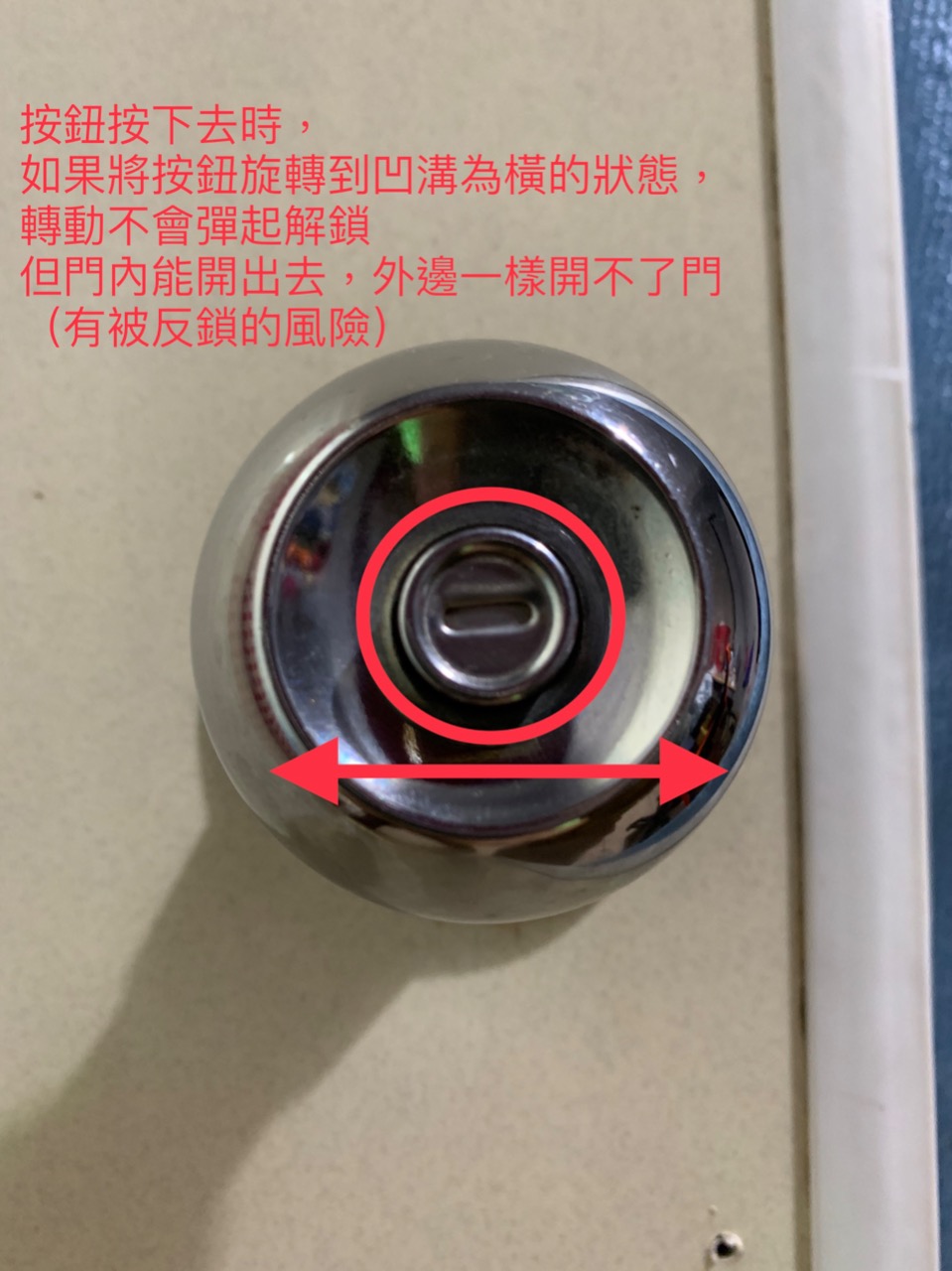 如下兩張圖為喇叭鎖門內按鈕有凹溝的類型,凹溝直的跟橫的功用不同(圖內有文字解釋)。 當然不是每個有凹溝的都像本篇圖釋這樣,也是有例如廁所門喇叭鎖,不管凹溝直或橫都能解鎖,但大部份舊式的房門喇叭鎖是會有反鎖的風險的 現在新式喇叭鎖沒有凹溝,沒有設計這種會反鎖自己的😅 不曉得有沒有人被這種舊式喇叭鎖搞過?