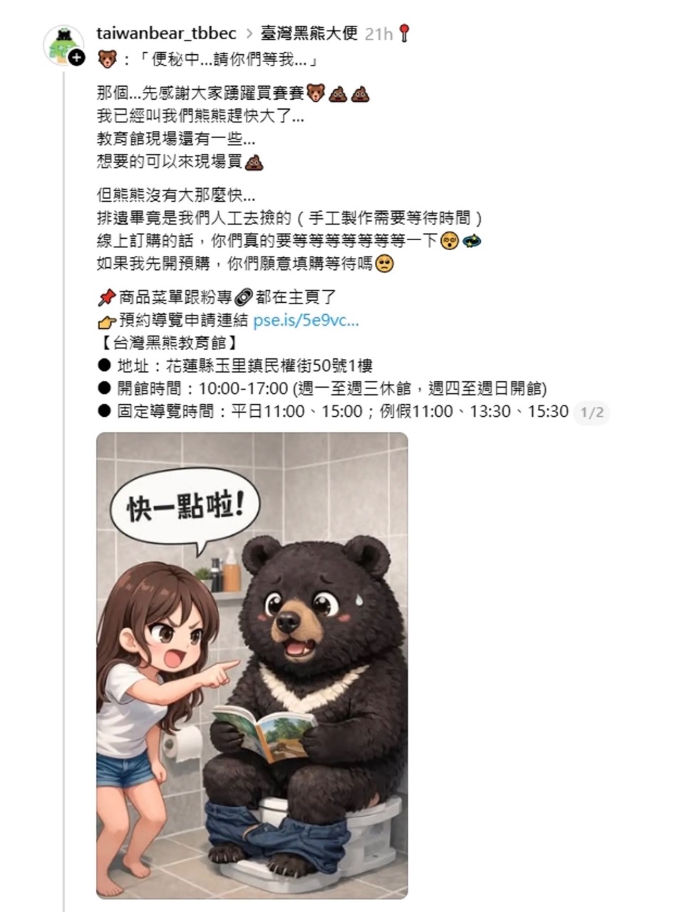 官方隨後索性「放飛自我」,在社群平台釋出黑熊蹲馬桶的趣味圖片,並幽默寫下:「便祕中……請大家等等我……」