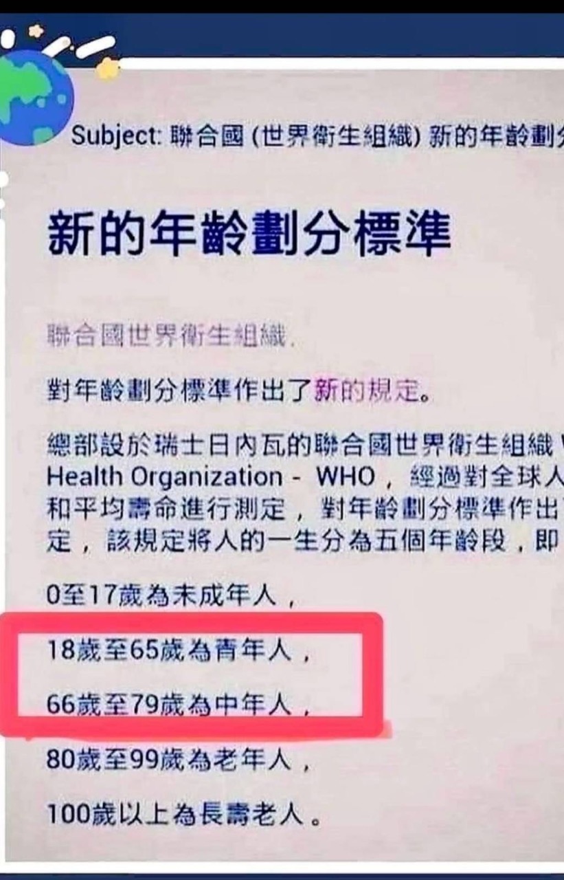 世界衛生組織新的年齡層劃分18-65歲為青年,這是什麼精神勝利法