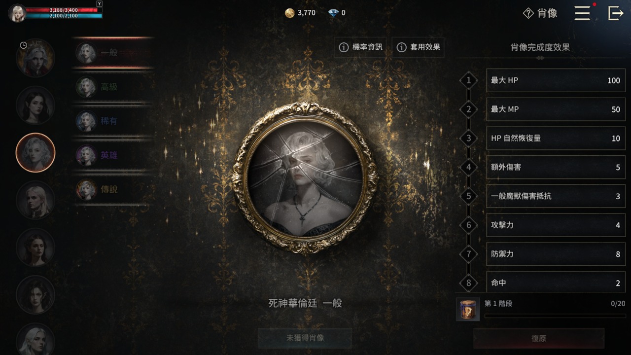 肖像也是利用修復增加特定屬性,不過能選擇的肖像類型多,可以選擇有所需屬性肖像投資。肖像與人物圖鑑中的NPC有關,透過血脈和支線劇情了解他們外,也能獲得道具和屬性加成等獎勵。其它還有坐騎、收藏、紀律、魔力研究、神器、質點等培育系統,除了投資所需屬性外,收集和解鎖也能額外獲得加成。聖三會用於大部份系統和裝備相關上,簡單化培育要收集素材。