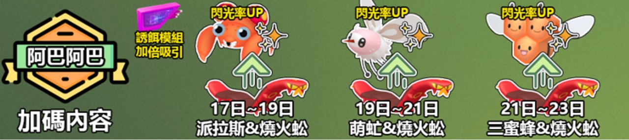 基礎獎勵加碼內容:根據日子不同,誘餌模組能吸引到的對象寶可夢亦會有所差異