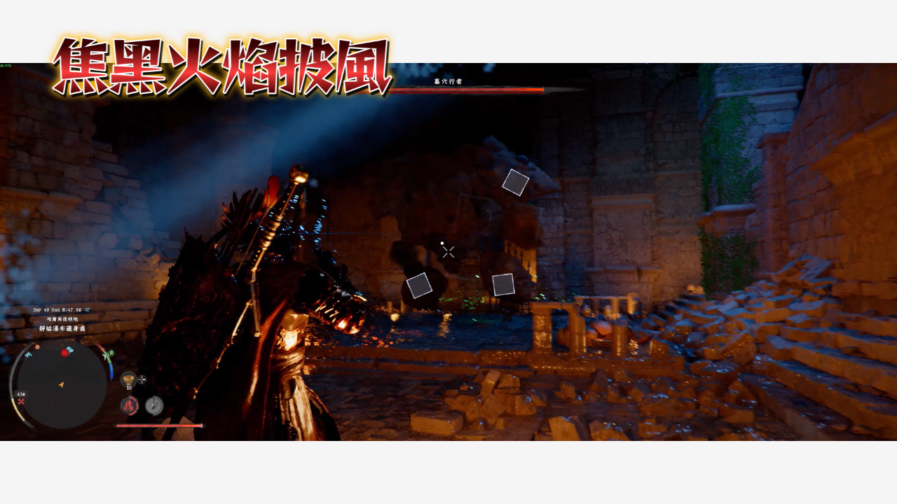 拿完手套之後我們從洞穴裡面出來,在瀑布旁邊的轉角處有一個開放洞穴可以進去,裡面有一個石頭人需要先解決,打贏他之後,後面有個鐵柵欄入口,點燃兩邊的石燈可以進去拿巫師手杖,拿完之後回到鐵柵欄門口右邊,我們爬上去,一樣到頂部,然後L2抓著牆壁使用勁法,位置要選好,不然很容易進不去,旋轉進去之後就可以拿到焦黑火焰披風,這個披風是整個遊戲前五好看的披風,搭配我前一集講的金光慾望套裝,根本完美搭配。