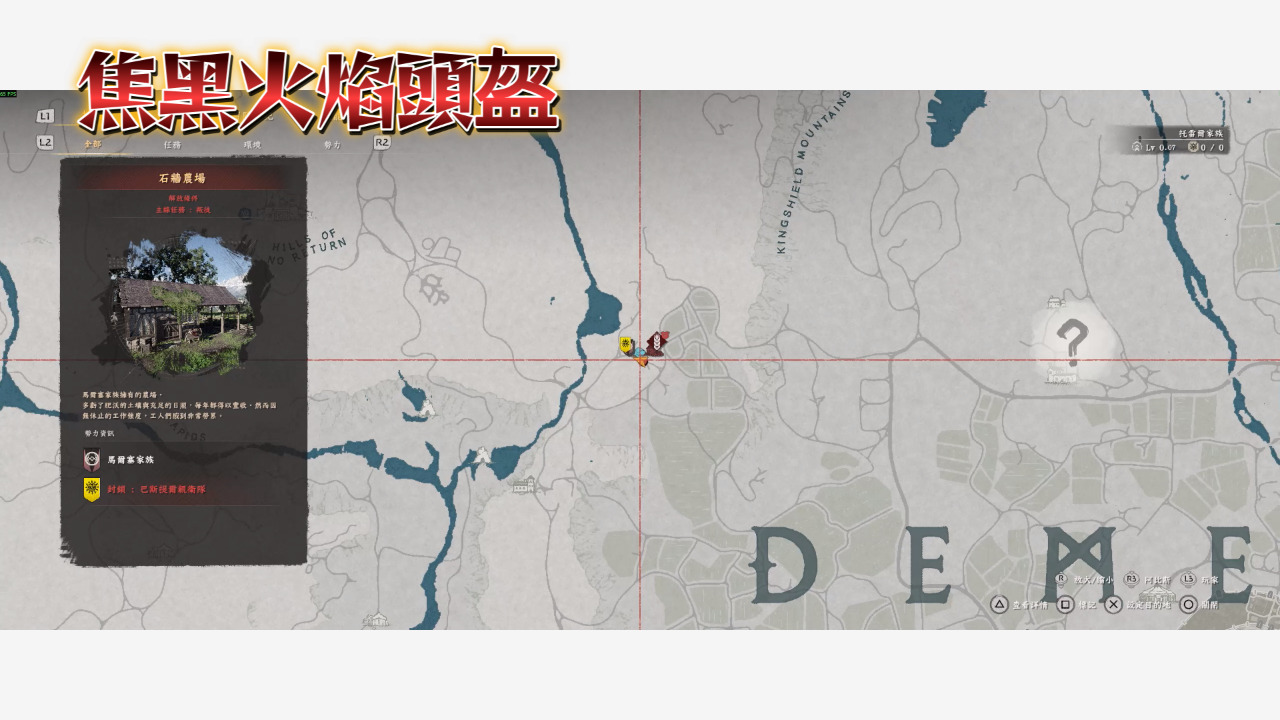拿完皮靴往右上角前進,那裏是石牆農場,地點在Demenis左上角,主線任務沒推到一定程度,來的時候會有敵人,清掉就好,在石牆農場南方有一座塔樓,沒有很高,我們爬上去從門進去拿寶箱,記得門後是一個洞,要小心不要摔下去,寶箱裡就是龍型頭盔焦黑火焰頭盔。