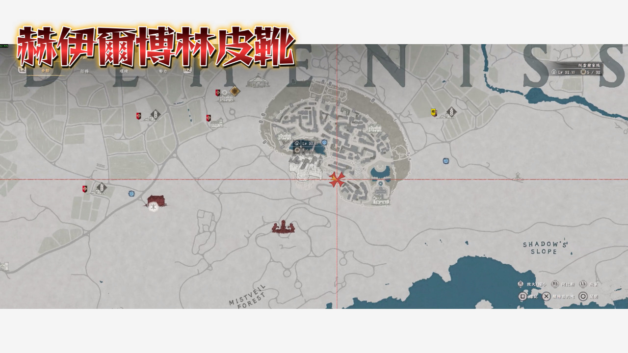 然後我們來到Demenis右下角南門出口旁的位子,這邊也給大家看一下地圖的方位,在城牆下面有個用木板封住的小洞我們可以鑽進去,從南門口過來爬上去來到城牆邊就會發現入口,蹲下按R2刺擊就可以破壞木板進去拿寶箱,這個靴子有個特別效果是額外銀幣獲得率增加10%而且有增加爆擊率,是很不錯的靴子。
