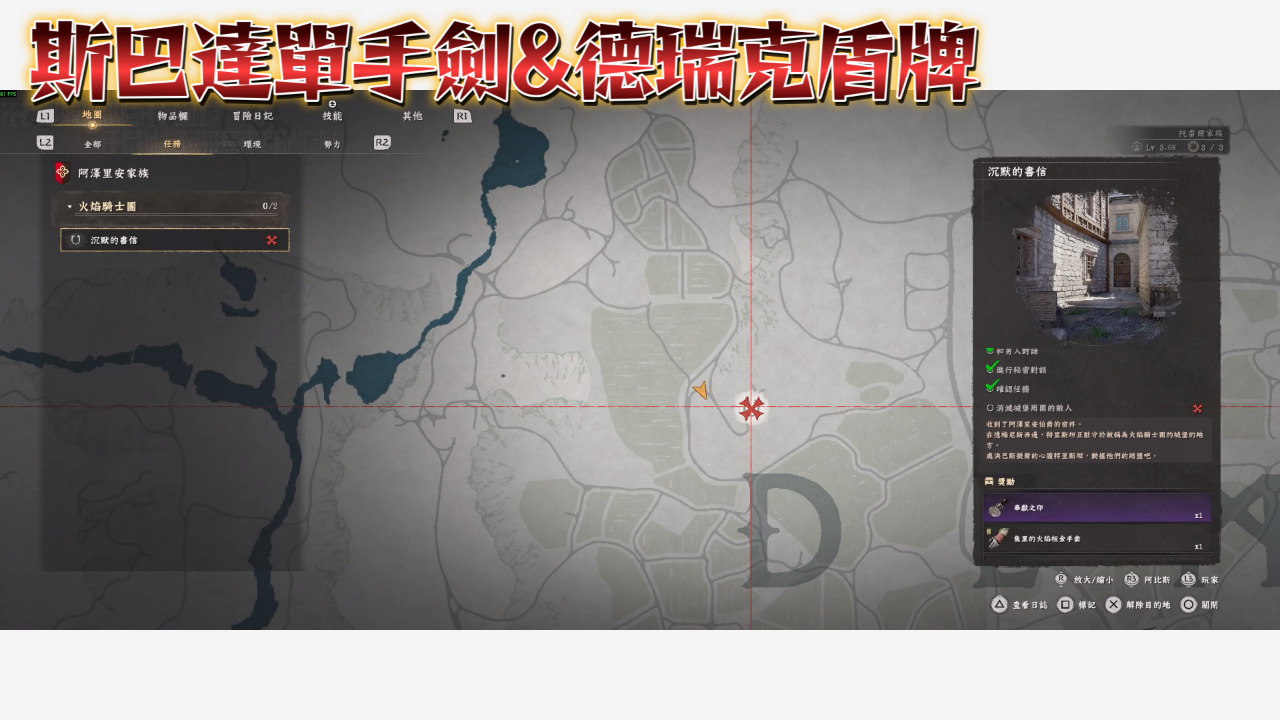 單手劍跟盾牌我們在主線第八章時接勢力任務,阿澤里安家族的火焰騎士團任務,我們要去攻略那一個小城堡,地點在Demenis的D字左上角,裡面會有一個BOSS叫火焰騎士,他用的招式就是火焰爆炸流的放大版,不會太難打,打贏之後在城堡的二樓可以拿到斯巴達單手劍,基本數值蠻出色的,喜歡雙持武器的玩家可以考慮看看。然後上去三樓,在一堆捆好的木柴前面可以拿到龍頭盾 - 德瑞克盾牌,這個盾牌目前是我看過最囂張的盾牌沒有之一,已經變成我的固定外觀選擇了。他還有個特效就是盾擊的時候會發射砲彈,是強力的持盾招式,每隔擋三次可以充能一次,充能後盾牌內襯還會發光。