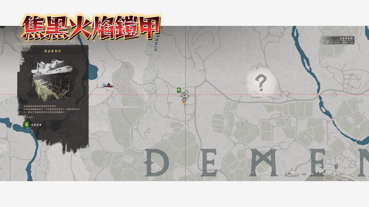 再來我們去Demenis的DE兩字上面,這邊看大地圖,有個地方叫黃金貿易所,黃金貿易所的南邊有一排木造建築,在兩個NPC的後面,有道看起來格格不入的木造門,這裡只要蹲下往前走,就可以進去整個建築底下的空間,裡面有寶箱可以開,可以拿到焦黑火焰盔甲。