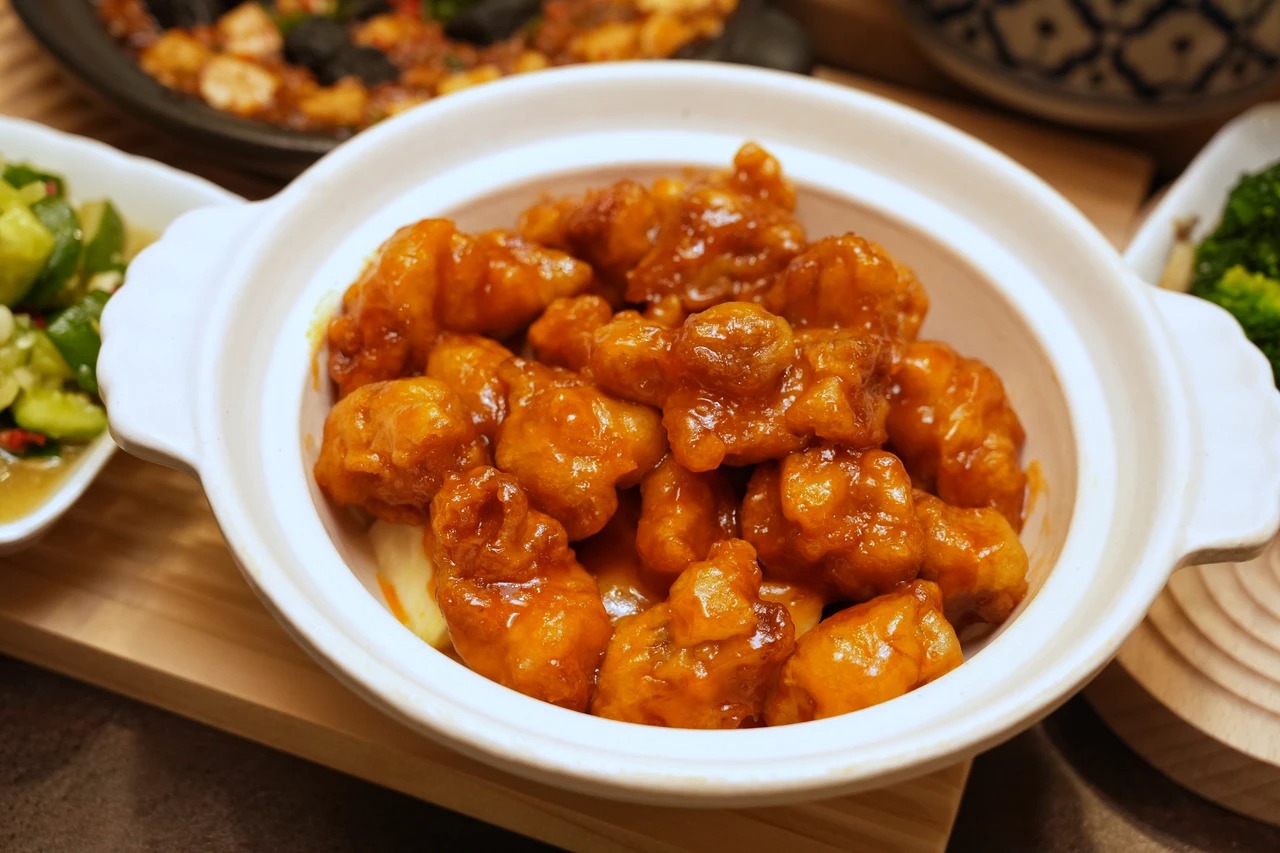 「真珠 台灣佳味」致敬料理仙女阿貝師傅,獻上酸甜開胃的「貝氏糖醋櫻桃肉 380元」,以梅花豬肉切丁、油炸至表面黃金色澤,再搭配酸甜適中的糖醋醬汁,乍看下宛如漂亮的櫻桃色澤。