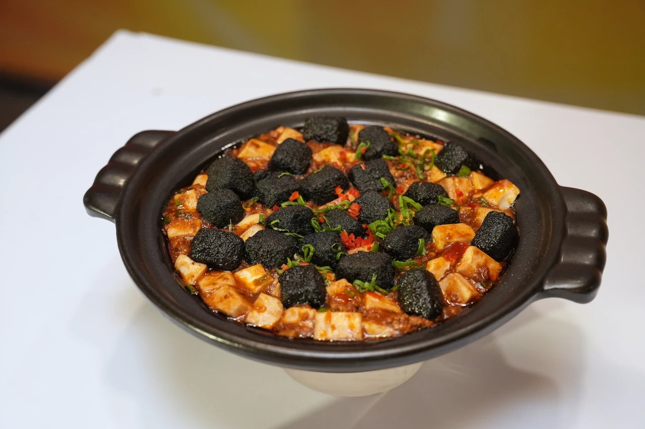 饗賓集團表示,「開飯川食堂」推出小當家招牌料理「大魔術熊貓豆腐 340元」,以竹炭黑豆腐炸過增加香氣與口感,加上滑嫩白豆腐,佐以特製花椒辣醬而成的麻婆醬汁,堪稱是白飯殺手!