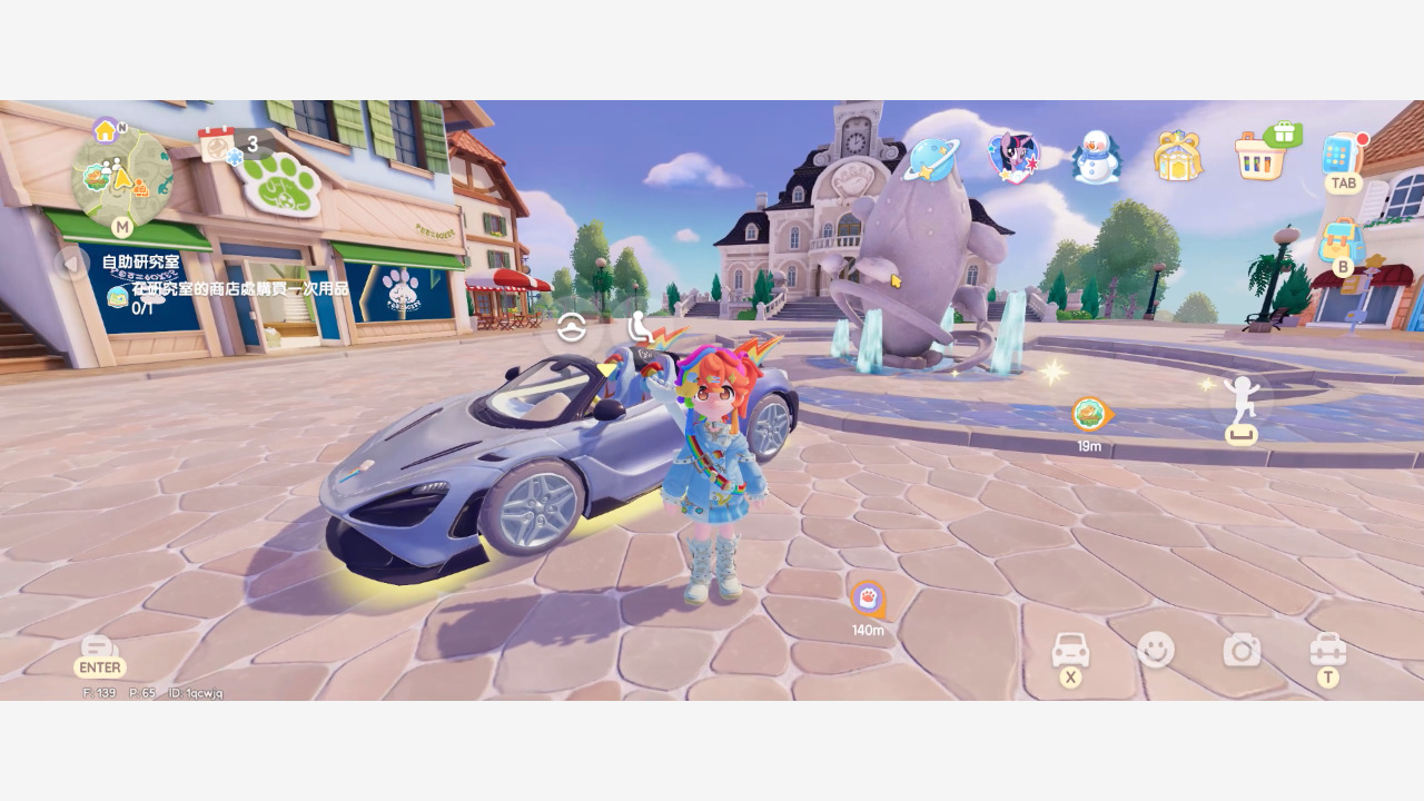 第五個幻夜星軌點開是虹能小馬珍奇,紫色公主捲的髮型配上白色緞帶,還有一個網紗帽,白色的披肩跟燈籠襪套,修身的白色小洋裝,走的是優雅路線,跑車車身有白色配紫色漸層的設計,車子後面有一個大大的蝴蝶結,車頭這裡要注意看上去有點淡淡的紫色,車尾是深紫色,前面有3個藍色水晶的標誌,底盤則是海藍色的LED燈特效,注意看方向盤也是粉紫色的,整體是星空的概念。