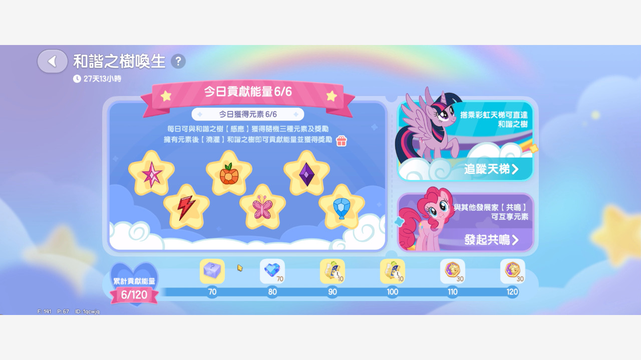 每次感應可以得到”魔法、誠實、慷慨、忠誠、善良、歡笑”六種能量的隨機三種,剩下的三種玩家需要跟朋友共鳴才可以湊滿每天的六種能量,有朋友問怎麼共鳴,只要打開和諧之樹的介面,右邊就有發起共鳴的選項,朋友點了你頭上的共鳴就會分享彼此的能量。我們也可以從和諧之樹介面下看到獎勵,全部拿完要120能量,裡面包含月光水晶,30張展演通票,所以我們盡量要找朋友共鳴滿每天的六個能量才能把全部獎勵拿到。