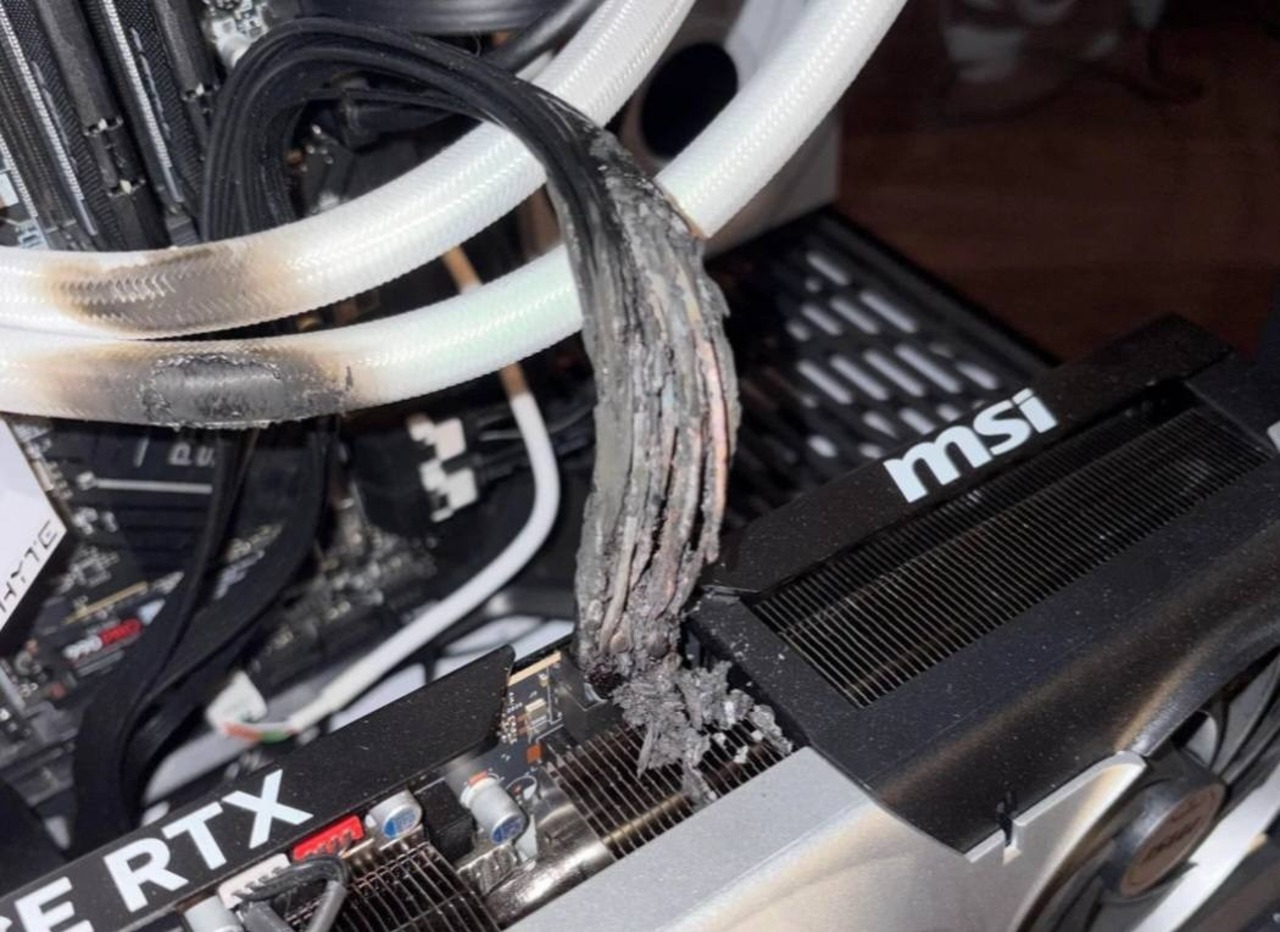 從照片中燒毀程度最嚴重位置位於接頭來看,推測是12V-2×6接頭內發生12V短路,但未能成功觸發電源供應器OCP(過電流保護)/SCP(短路保護),持續供電下造成短路處產生大量熱量,點燃接頭及線材出現明火。