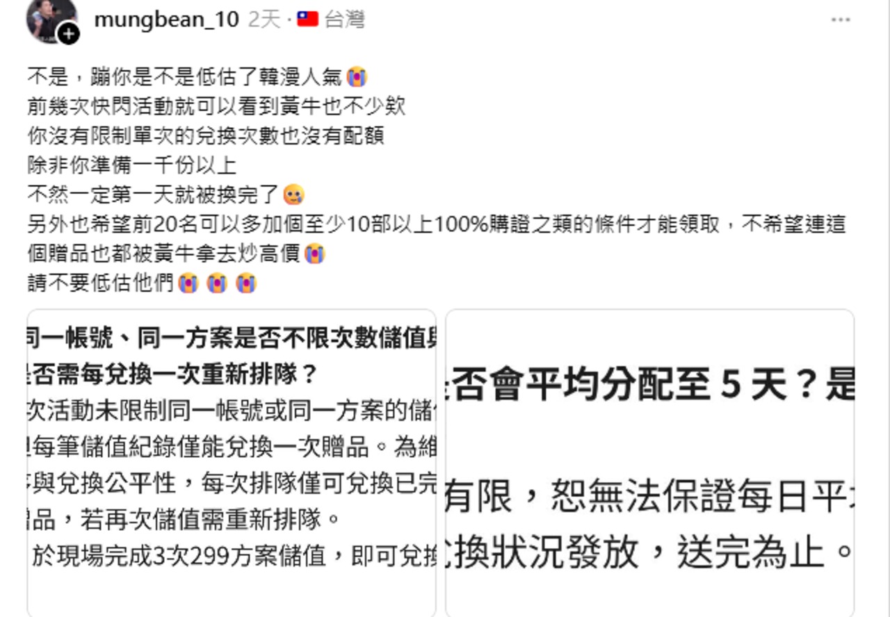 另一家網路漫畫廠商也同樣遭遇人潮湧現購買,結果規則一改再改,改到想買現場限定的儲值活動都買不到。