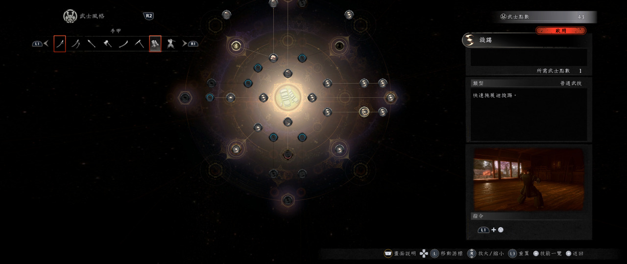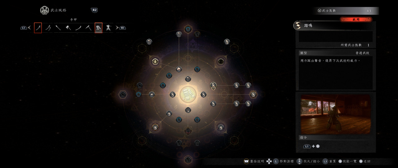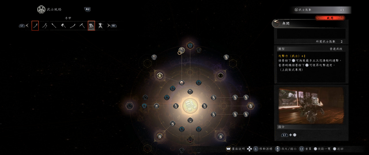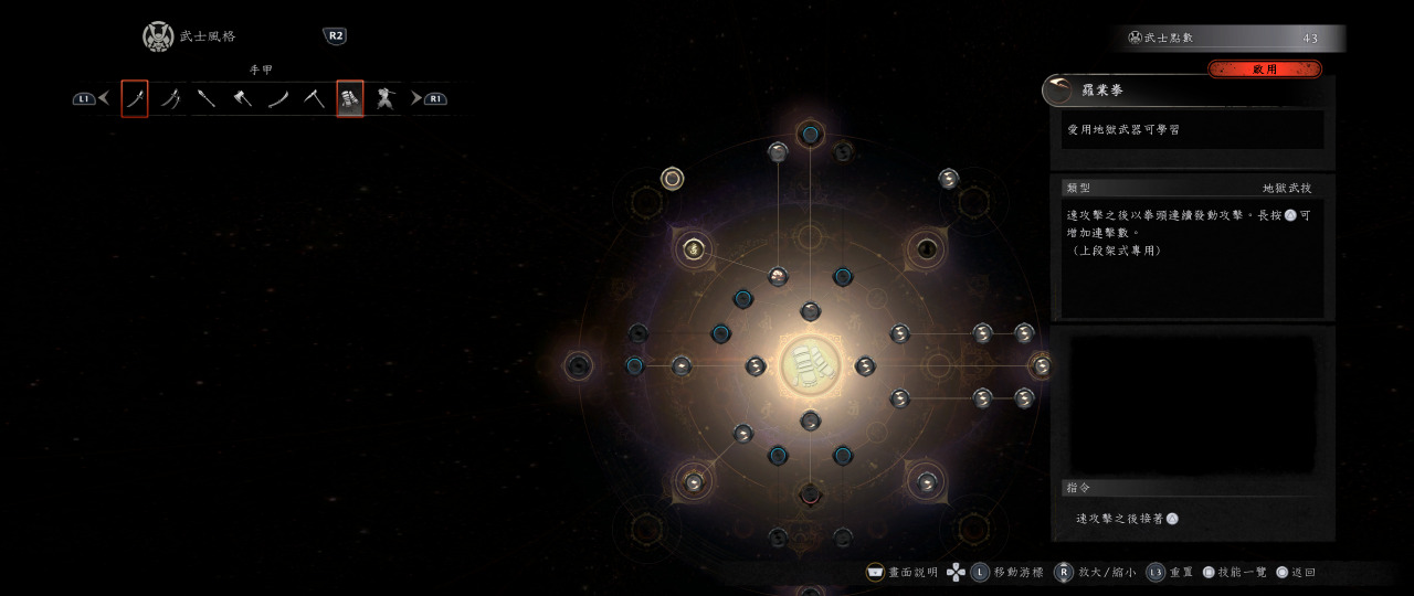 首先我們講中段,平常中段是拿來閃避跟普攻來累積琢技量表,使用琢技時手甲是不用換段就可以不斷琢技連招的,五月雨踢擊(按著三角形重擊)起手,當你看到最後一招空中翻一圈踢下來後,馬上接”踏鳴”L1+正方形震地加傷害buff,震地完之後繼續五月雨踢擊,然後反覆循環,這套是只要怪物不反擊就可以琢技一直連下去,是手甲的特性,所以在王耐力被打空後,這個是連招的選擇之一。