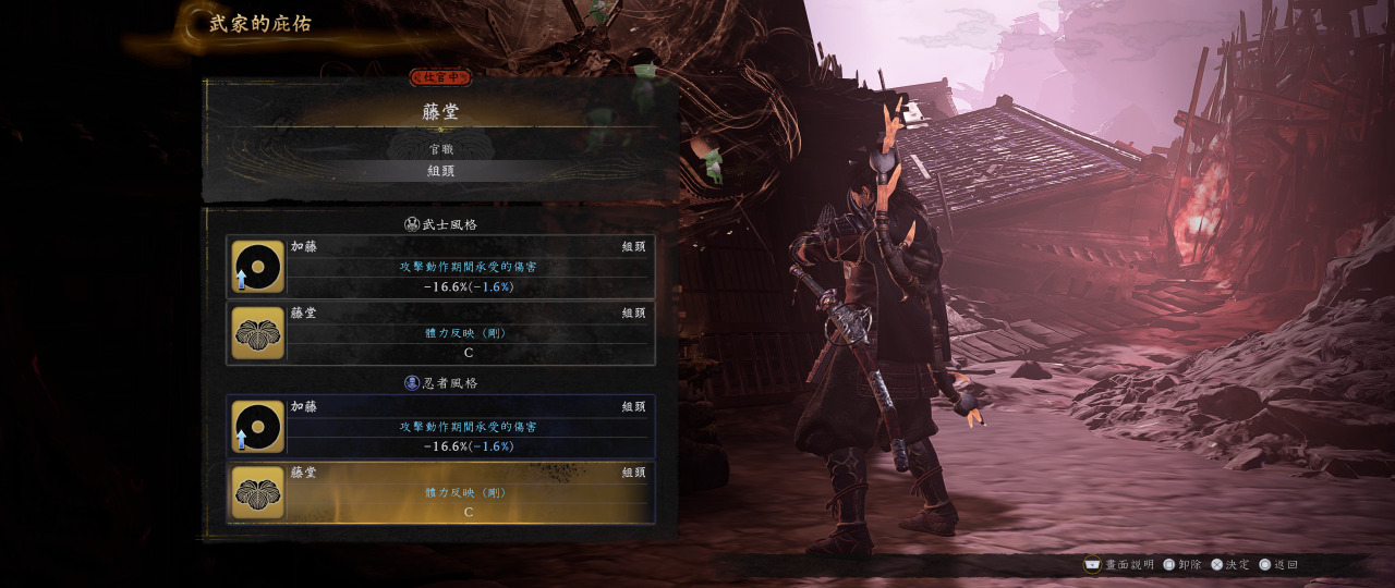 原因是我們勢力會選擇加藤,施放武技時受到的傷害降低,然後第二個選藤堂,它的體力反應(剛)對血量的加成可以讓你的HP乘以兩倍,我現在144級,血量破五千,容錯率大大提升,所以我才說在我測試過吸血組合後,我還是覺得不如選增傷之類的詞條吧,吸的血不如喝一罐水準備打琢技。