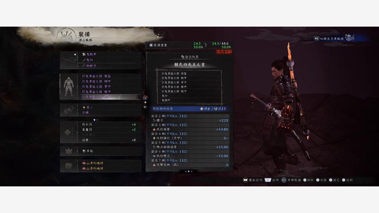 套裝我們就選有賴光四天王之首效果的討鬼勇猛之鎧套裝。