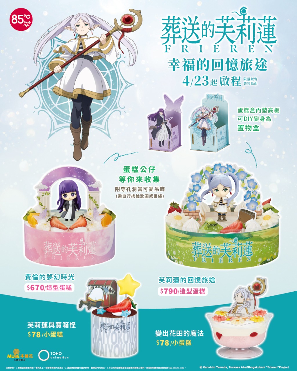 這次85℃主打的兩款造型蛋糕「芙莉蓮的回憶旅途」與「費倫的夢幻時光」,直接把芙莉蓮與費倫立體化呈現在蛋糕上方,附有可拆式公仔設計,粉絲吃完後還能留下來當收藏或改造成吊飾使用。
