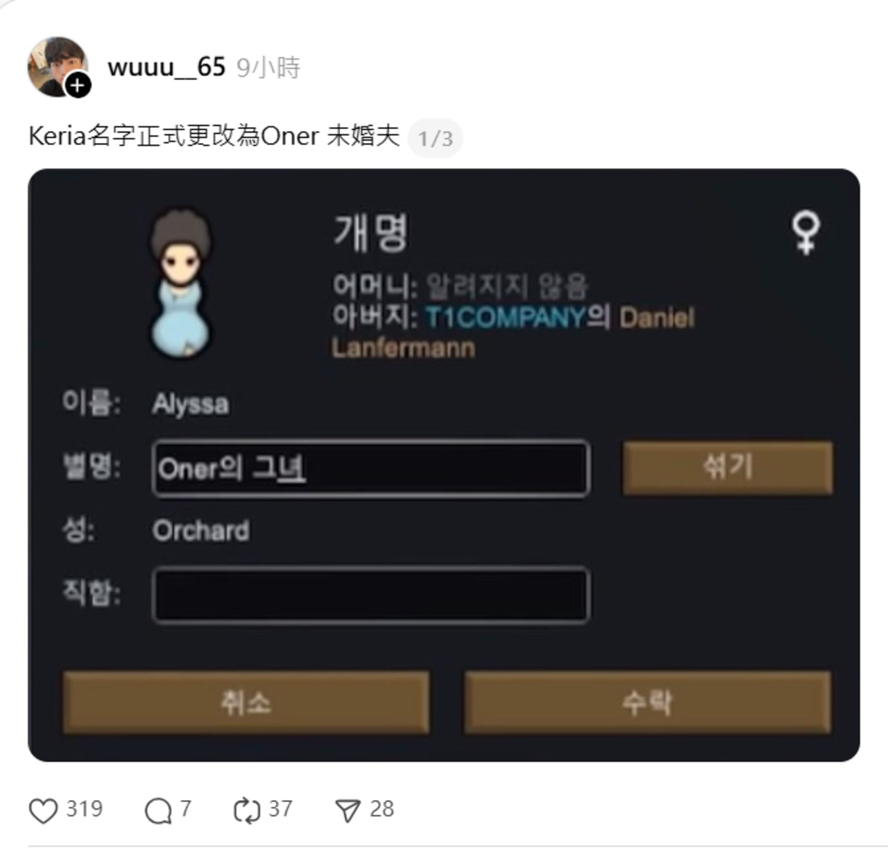 最新進度Keria名字正式更改為Oner 未婚夫