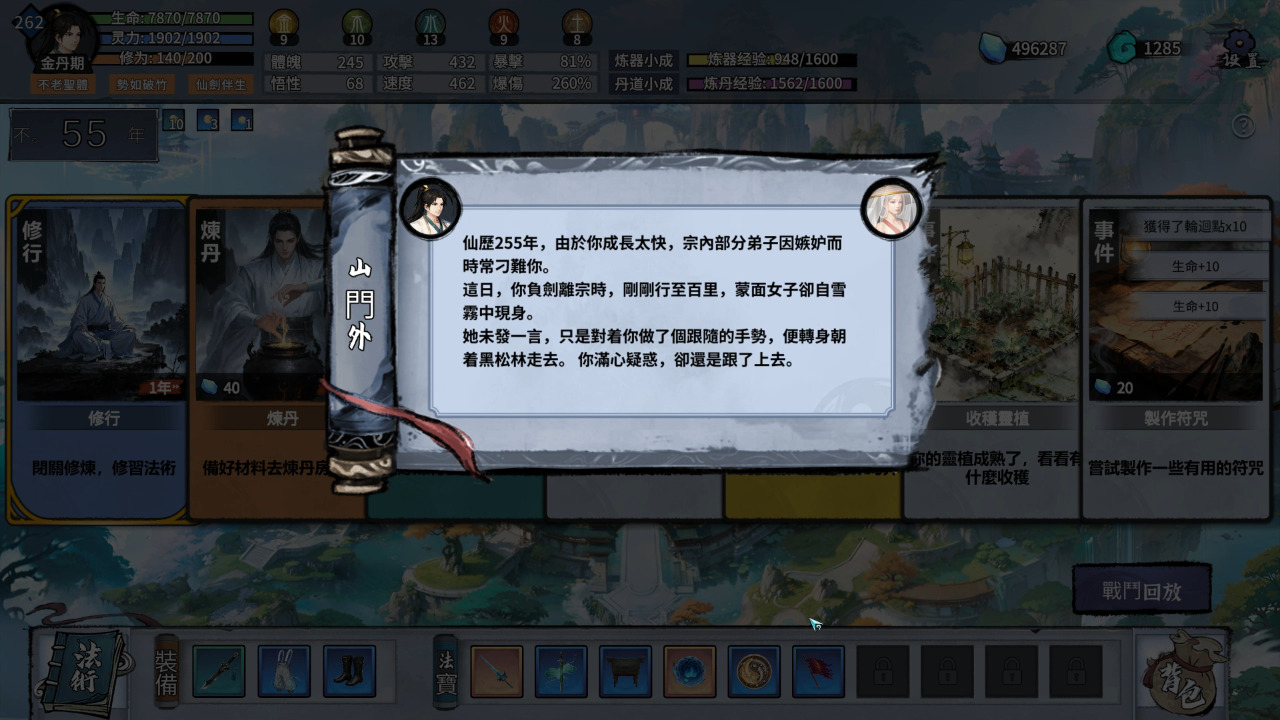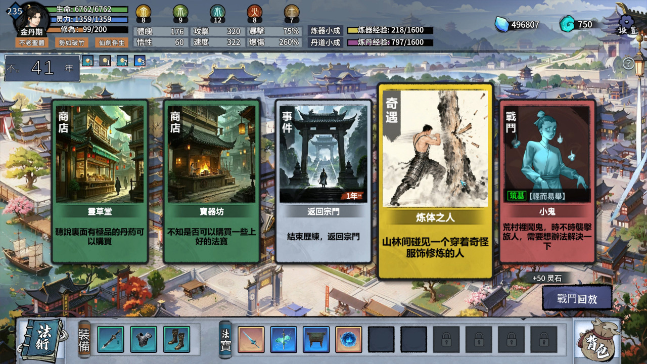41歲那年一隻我曾救過的白狐叼著仙草溜進了我的洞府,沒想到當年的救命之恩還會遇到如此奇遇,正當我想著牠可不可以化形前牠就跑掉了,不過這株仙草讓我增加了許多靈力。同年我還在山下遇到另一個奇遇,有個穿著玄鐵背帶褲的體修竟靠著揮拳的氣壓即可摧金斷木,我快步上前想跟他學學本事,他交給我一門坤門練體術,並給我類似的玄鐵背帶褲,且交代我持之以恆遲早必成體修大能,我連聲謝過。此後每場戰鬥我都能增加體魄,而我下山歷練搜尋奇遇跟戰鬥也越來越頻繁。