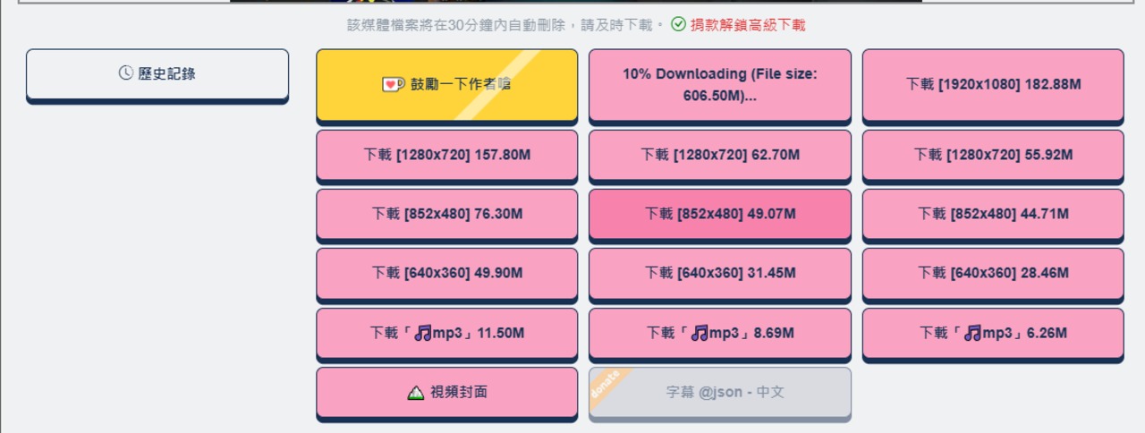 步驟四:解析完成後,頁面會顯示多種畫質選項,點選所需畫質,下載進度將即時呈現;下載時間與影片長度成正比(長影片可能需數分鐘至數十分鐘),請全程保持瀏覽器視窗開啟,避免意外關閉導致進度歸零,需從頭重啟。當進度達100%時,系統會彈出儲存視窗,讓你將檔案存至電腦。