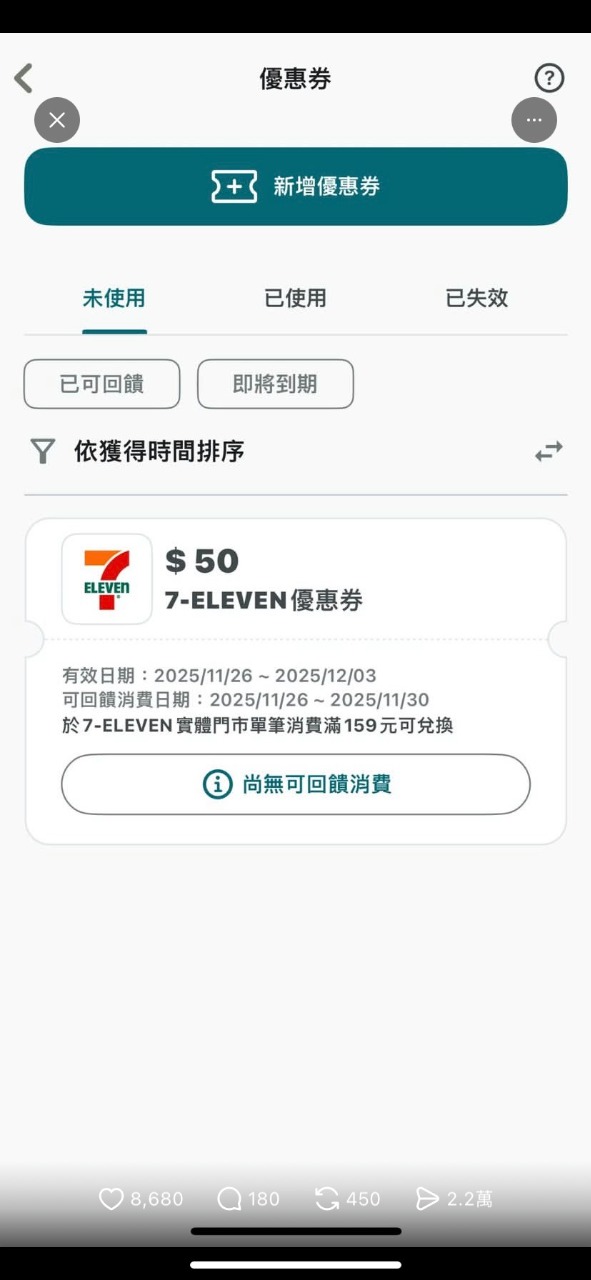 只要簡單幾步就可以領到小七50元的優惠卷 在ipass money app首頁點優惠卷,在點新增優惠卷,輸入 "七不可失",就可以拿到優惠卷囉~ 用ipass money app到小七消費只要滿159就可以用 時間是11/26~11/30 對小七好朋友來說真的是還不錯,跟大家分享一下