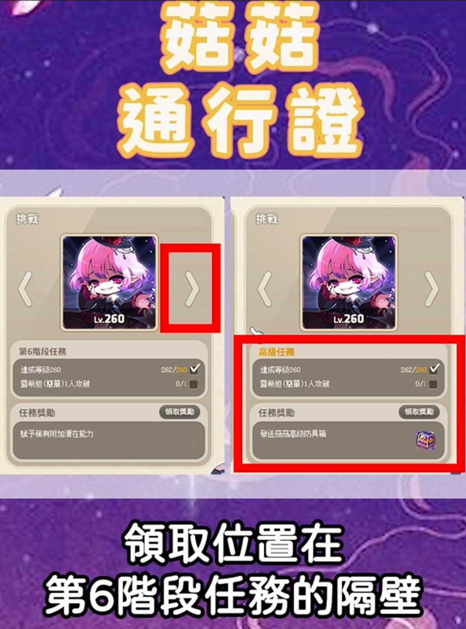 關於菇菇通行證常有的疑問 如果沒有買高級菇菇通行證的話 菇菇支援裝備套組無法升級成永久 有購買高級菇菇通行證的話 打贏簡單露希妲之後 即可獲得永久的高級菇菇防具箱 領取位置在第6階段任務的隔壁