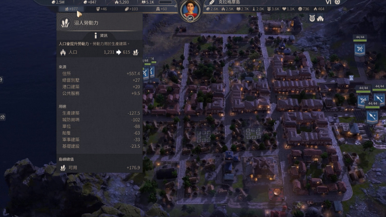人口其實相當難升,這一代我覺得人口設計得不太好,基礎一級人口的限制影響最大的就是軍營裡的單位跟船艦的數量,每種軍事單位都會消耗基礎人口,還會有維持費。所以講嚴重點,我們一級人口社區裡面一定要放增加人口的特殊建築,因為一級人口是最主要的結構,消耗也特別嚴重。