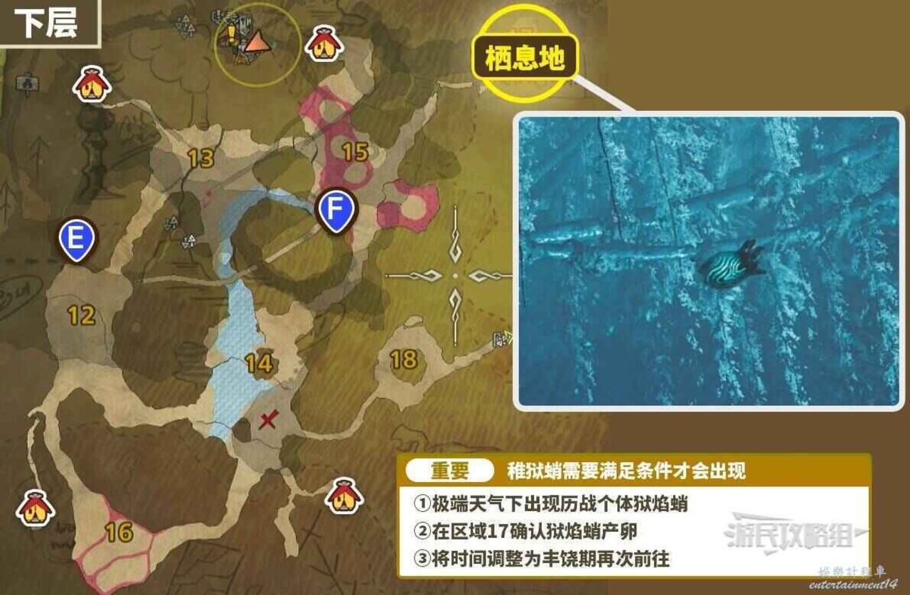 想要獄焰蛸幼崽出現,環境必須為極端天氣(暴火),野外必須出現歷戰個體的獄焰蛸。打開地圖查看【環境概要】即可看到出現的怪物。可以在營地中反覆休息進行調整,直到滿足上述條件。