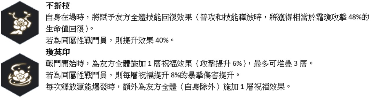 霜瓊本身職業是醫療,確保整個隊伍的生命值維持是最重要的任務,因此推薦使用「心之鳴動」來強化治療效果,同時也能提升護盾量。