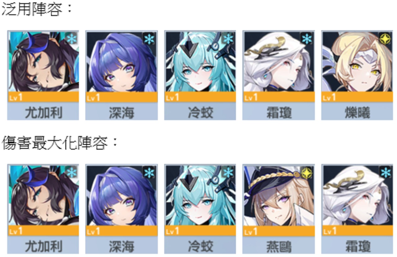 如果覺得霜瓊的攻擊力提升不夠,可以搭配燕鷗來進一步強化來挑戰限時關卡,若沒有回合限制,可以使用泛用陣容來強化穩定性。