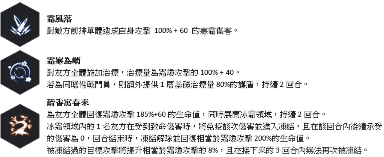 凝冰三尺‧初(星階3):冰霜領域的可凍結人數+1,且每次釋放源能爆發時,自身治療效果+4%,持續至戰鬥結束,最多疊加5層。